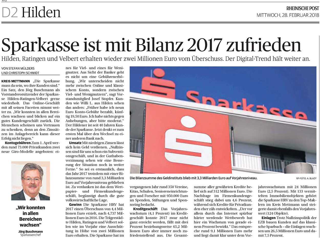 KREIS METTMANN „Die Sparkasse muss da sein, wo ihre Kunden sind.“ Ein Satz, den Jörg Buschmann als Vorstandsvorsitzender der Sparkasse Hilden-Ratingen-Velbert gerne wiederholt. Ob Vorstandskollege Wolfgang Busch es deshalb angesichts der aktuellen Grippewelle einem großen Teil der Kunden gleich tat und das Bett hütete, bleibt sein Geheimnis. Jedenfalls überließ er es krankheitsbedingt Buschmann und Josef Stopfer, die Jahreszahlen 2017 der Sparkasse zu präsentieren. Und zumindest hier traf Buschmanns Satz wieder voll ins Schwarze: Das Online-Geschäft mit all seinen Facetten nimmt weiter zu. Aber auch insgesamt ist der Vorstand mit dem abgelaufenen Jahr zufrieden. „Wir konnten in allen Bereiche wachsen und blicken auf ein gutes Kundengeschäft zurück“, sagt Buschmann. „Die Menschen scheinen uns das Vertrauen zu schenken, denn an den Zinssätzen im Anlagebereich kann dieser Erfolg nicht liegen.“