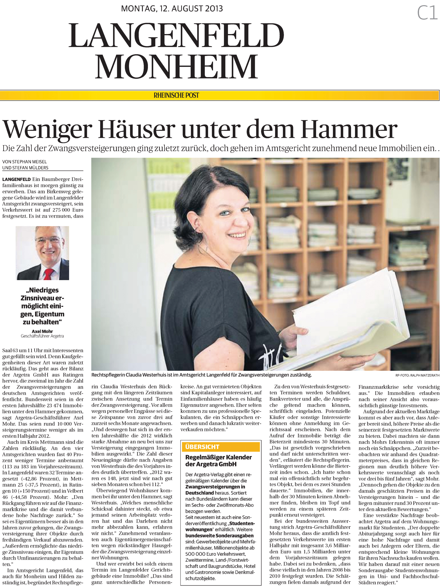 Rund 10 000 Termine wurde im ersten Halbjahr 2013 weniger veranschlagt als im Vorjahreszeitraum, was einem Rückgang von fast 30 Prozent entspricht. „Die genaue Zahl der Termine liegt bei bundesweit 23 474, was immer noch über dem Niveau des Jahres 2000 liegt“, weiß Argetra-Geschäftsführer Axel Mohr. Auch im Kreis Mettmann sind die Zahlen rückläufig. An den vier Amtsgerichten wurden fast 40 Prozent weniger Termine anberaumt (113 zu 183 im Vorjahreszeitraum). In Langenfeld waren 32 Termine angesetzt (-42,86 Prozent), in Mettmann 25 (-37,5 Prozent), in Ratingen 10 (+150 Prozent) und in Velbert 46 (-44,58 Prozent). In den Verkehrswerten sticht Ratingen noch deutlicher heraus, weil sich hier im ersten Halbjahr ein Gewerbeobjekt mit einem Wert über sieben Millionen Euro in der Versteigerung befand. Das wirkt sich auch kreisweit aus, denn trotz deutlich rückläufiger Terminanzahl stieg die Versteigerungssumme um fast drei Millionen Euro auf 40,5 Millionen.