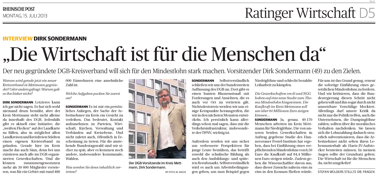 Sondermann Ja, genau. 49 170 Menschen arbeiten im Kreis Mettmann für Niedriglöhne. Die von unseren beiden Gewerkschaften in Auftrag gegebene Studie des Hannoveraner Pestel-Instituts hat ergeben, dass bei Einführung eines verpflichtenden Mindestlohns von 8,50 Euro die Kaufkraft auf 84,4 Millionen Euro steigen würde. Zudem gehen die Wissenschaftler davon aus, dass dieser Zuwachs nahezu eins zu eins in den Konsum fließen würde. Für uns ist das Grund genug, erneut die sofortige Einführung eines gesetzlichen Mindestlohns zu fordern. Und wir kritisieren, dass die Bundesregierung diesen Schritt nicht gehen will und ihn sogar durch nicht umsetzbare Vorschläge blockiert. Allerdings darf unsere Kritik da nicht nur die Politik treffen, auch die Unternehmen, die Dumpinglöhne zahlen, sollten über ihr moralisches Verhalten nachdenken. Sie lassen sich die Lohnzahlung dadurch steuerlich subventionieren, dass die Arbeitnehmer nicht selten ihren Lebensunterhalt als Hartz-IV-Aufstocker bestreiten müssen. In meinen Augen sollte der Grundsatz gelten: Wirtschaft ist für die Menschen da, nicht umgekehrt!