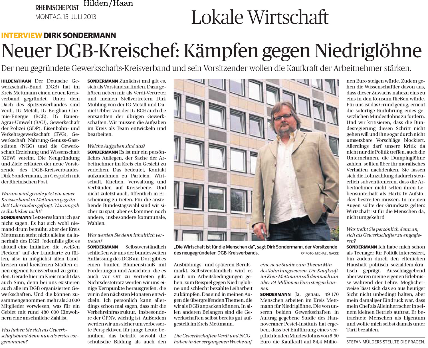 Sondermann Selbstverständlich schließen wir uns der bundesweiten Auffassung des DGB an. Dort gibt es einen bunten Blumenstrauß mit Forderungen und Ansichten, die es auch vor Ort zu vertreten gilt. Nichtsdestotrotz werden wir uns einige Kernpunkte herausgreifen, die wir in den nächsten Monaten entwickeln. Ich persönlich kann allerdings schon mal sagen, dass mir die Verkehrsinfrastruktur, insbesondere der ÖPNV, wichtig ist. Außerdem werden wir uns sicher um verbesserte Perspektiven für junge Leute bemühen, das betrifft sowohl die schulische Bildung als auch den Ausbildungs- und späteren Berufsmarkt. Selbstverständlich wird es auch um Arbeitsbedingungen gehen, zum Beispiel gegen Niedriglöhne und schlecht bezahlte Leiharbeit zu kämpfen. Das sind in meinen Augen die übergreifenden Themen, die wir als DGB anpacken können. In allen anderen Belangen sind die Gewerkschaften selbst bereits gut aufgestellt im Kreis Mettmann.