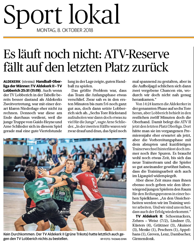 ALDEKERK (stemu) Handball Oberliga Männer: TV Aldekerk II – TV Lobberich 25:31 (11:19). Auch wenn der TV Lobberich in der Tabelle bereits besser dastand als Aldekerks Zweitvertretung, war mit einer derart klaren Niederlage eher nicht zu rechnen. Dennoch war diese am Ende durchaus verdient, weil die junge Truppe von Guido Heyne und Arne Schlieder sich in diesem Spiel gerade mal eine gute Viertelstunde lang in der Lage zeigte, guten Handball zu spielen. Das größte Problem war, dass das Team die Anfangsphase etwas verschlief. Zwar sah es in den ersten Minuten bis zum 5:6 noch ganz gut aus, doch dann setzte Loberreich sich ab. „Sechs Tore Rückstand aufzuholen war dann doch etwas zu viel für Jungs“, sagt Arne Schlieder. „In der zweiten Hälfte waren wir zwar drauf und dran, das Spiel noch mal spannend zu gestalten, aber in die Aufholjagd schlichen sich dann zwei vergebene Chancen ein, wodurch wir doch nicht nah genug herankamen.“ Von 14:24 kamen die Aldekerker in der Phase auf sechs Tore heran, aber Lobberich behielt in den verbliebenen zwölf Minuten doch die Oberhand. Damit belegt die ATV II jetzt den letzten Platz Oberliga. Dort hätte man sie im vergangenen Premierenjahr eher erwartet als jetzt, aber die Vorbereitungsphase mit dem abrupten und kurzfristigen Trainerwechsel hinterlässt doch immer noch ihre Spuren. Es braucht wohl noch etwas Zeit, mit das neue Trainerteam und die Spieler sich so gut aneinander gewöhnt haben, dass die Trainingsarbeit sich auch im Ligaspiel wiederspiegelt. Aber diese Zeit muss man ihnen ebenso noch geben wie den überwiegend jungen Spielerin den Raum für den Reifungsprozess in einer hohen Spielklasse. „An den Unsicherheiten werden wir im Training weiter arbeiten und wir sind uns sicher, dass auch der Erfolg wiederkommt.“