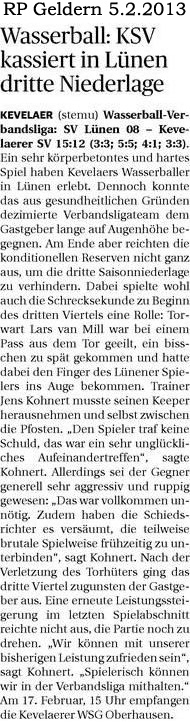KEVELAER (stemu) Wasserball-Verbandsliga: SV Lünen 08 - Kevelaerer SV 15:12 (3:3; 5:5; 4:1; 3:3). Ein sehr körperbetontes und hartes Spiel haben Kevelaers Wasserballer in Lünen erlebt. Dennoch konnte das aus gesundheitlichen Gründen dezimierte Verbandsligateam dem Gastgeber lange auf Augenhöhe begegnen. Am Ende aber reichten die konditionellen Reserven nicht ganz aus, um die dritte Saisonniederlage zu verhindern. Dabei spielte wohl auch die Schrecksekunde zu Beginn des dritten Viertels eine Rolle: Torwart Lars van Mill war bei einem Pass aus dem Tor geeilt, ein bisschen zu spät gekommen und hatte dabei den Finger des Lünener Spielers ins Auge bekommen. Trainer Jens Kohnert musste seinen Keeper herausnehmen und selbst zwischen die Pfosten. „Den Spieler traf keine Schuld, das war ein sehr unglückliches Aufeinandertreffen“, sagte Kohnert. Allerdings sei der Gegner generell sehr aggressiv und ruppig gewesen: „Das war vollkommen unnötig. Zudem haben die Schiedsrichter es versäumt, die teilweise brutale Spielweise frühzeitig zu unterbinden“, sagt Kohnert. Nach der Verletzung des Torhüters ging das dritte Viertel zugunsten der Gastgeber aus. Eine erneute Leistungssteigerung im letzten Spielabschnitt reichte nicht aus, die Partie noch zu drehen. „Wir können mit unserer bisherigen Leistung zufrieden sein“, sagt Kohnert. „Spielerisch können wir in der Verbandsliga mithalten.“ Am 17. Februar, 15 Uhr empfangen die Kevelaerer WSG Oberhausen.
