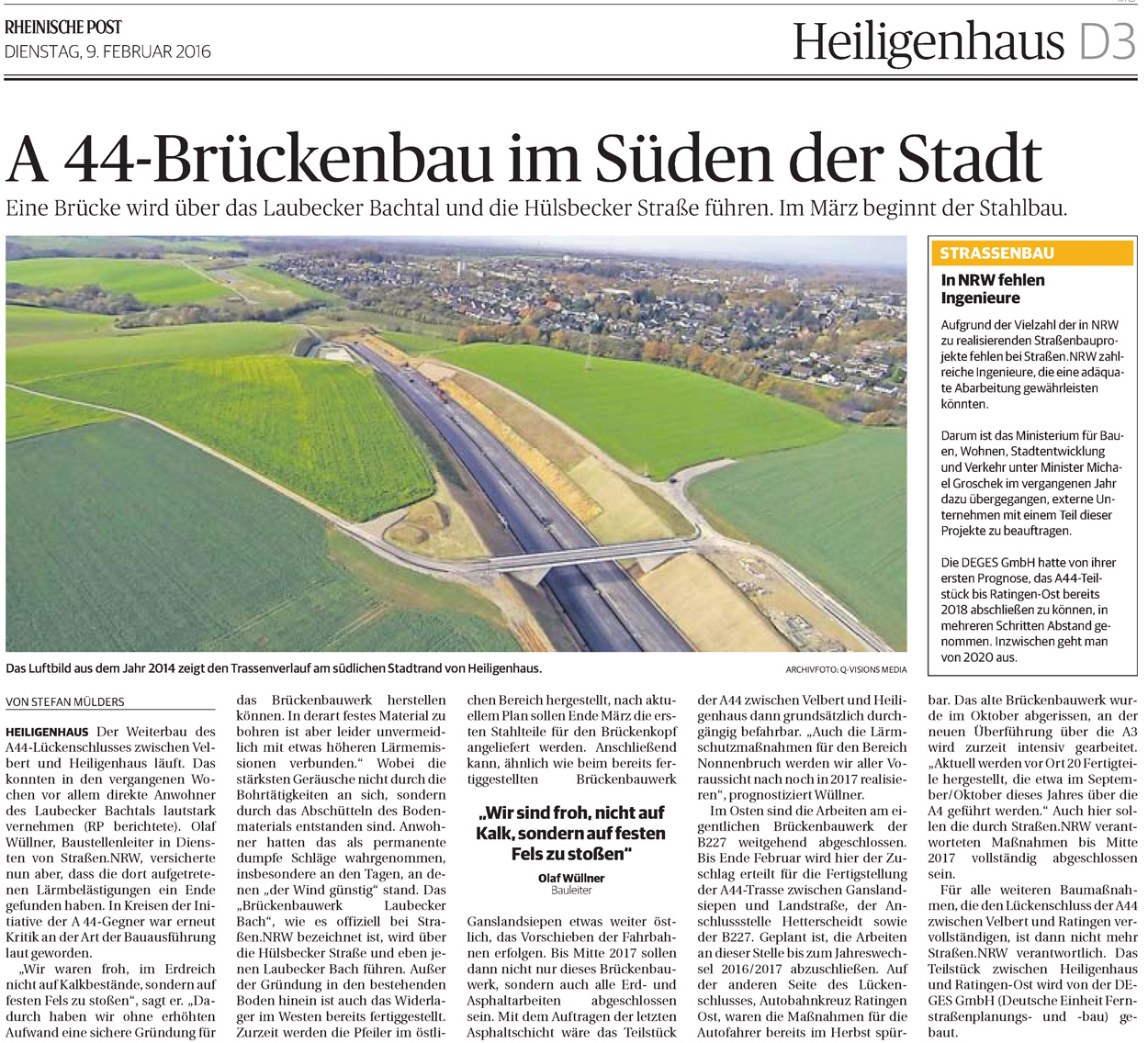 HEILIGENHAUS Der Weiterbau des A44-Lückenschlusses zwischen Velbert und Heiligenhaus läuft. Das konnten in den vergangenen Wochen vor allem direkte Anwohner des Laubecker Bachtals lautstark vernehmen (RP berichtete). Olaf Wüllner, Baustellenleiter in Diensten von Straßen.NRW, versicherte nun aber, dass die dort aufgetretenen Lärmbelästigungen ein Ende gefunden haben. „Wir waren froh, im Erdreich nicht auf Kalkbestände, sondern auf festen Fels zu stoßen“, sagt er. „Dadurch haben wir ohne erhöhten Aufwand eine sichere Gründung für das Brückenbauwerk herstellen können. In derart festes Material zu bohren ist aber leider unvermeidlich mit etwas höheren Lärmemissionen verbunden.“ Wobei die stärksten Geräusche nicht durch die Bohrtätigkeiten an sich, sondern durch das Abschütteln des Bodenmaterials entstanden sind. Anwohner hatten das als permantente dumpfe Schläge wahrgenommen, insbesondere an den Tagen, an denen „der Wind günstig“ stand. Das „Brückenbauwerk Laubecker Bach“, wie es offiziell bei Straßen.NRW bezeichnet ist, wird über die Hülsbecker Straße und eben jenen Laubecker Bach führen. Außer der Gründung in den bestehenden Boden hinein ist auch das Widerlager im Westen bereits fertiggestellt. Zurzeit werden die Pfeiler im östlichen Bereich hergestellt, nach aktuellem Plan sollen Ende März die ersten Stahlteile für den Brückenkopf angeliefert werden. Anschließend kann, ähnlich wie beim bereits fertiggestellten Brückenbauwerk Ganslandsiepen etwas weiter östlich, das Vorschieben der Fahrbahnen erfolgen. Bis Mitte 2017 sollen dann nicht nur dieses Brückenbauwerk, sondern auch alle Erd- und Asphaltarbeiten abgeschlossen sein. Mit dem Auftragen der letzten Asphaltschicht wäre das Teilstück der A44 zwischen Velbert und Heiligenhaus dann grundsätzlich durchgängig befahrbar. „Auch die Lärmschutzmaßnahmen für den Bereich Nonnenbruch werden wir aller Voraussicht nach noch in 2017 realisieren“, prognostiziert Wüllner.