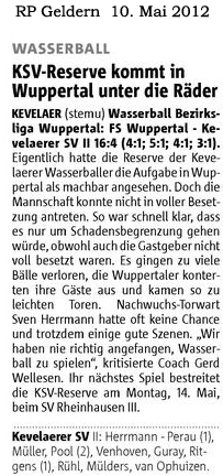 KEVELAER (stemu) Wasserball Bezirksliga Wuppertal: FS Wuppertal - Kevelaerer SV II 16:4 (4:1; 5:1; 4:1; 3:1). Eigentlich hatte die Reserve der Kevelaerer Wasserballer die Aufgabe in Wuppertal als machbar angesehen. Doch die Mannschaft konnte nicht in voller Besetzung antreten. So war schnell klar, dass es nur um Schadensbegrenzung gehen würde, obwohl auch die Gastgeber nicht voll besetzt waren. Es gingen zu viele Bälle verloren, die Wuppertaler konterten ihre Gäste aus und kamen so zu leichten Toren. Nachwuchs-Torwart Sven Herrmann hatte oft keine Chance und trotzdem einige gute Szenen. „Wir haben nie richtig angefangen, Wasserball zu spielen“, kritisierte Coach Gerd Wellesen. Ihr nächstes Spiel bestreitet die KSV-Reserve am Montag, 14. Mai, beim SV Rheinhausen III.