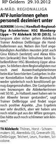 ALDEKERK (stemu) Handball-Regionalliga A-Juniorinne: HSG Blomberg-Lippe - TV Aldekerk 50:10 (30:5). So langsam aber sicher gehen Aldekerks Trainer Andreas Dellbrügge die Handballerinnen aus. Neben den fünf angekündigten Ausfällen mussten jetzt auch Gina Klütsch (verletzt) und Alexa Klösters (erkrankt) ihre Teilnahme beim Tabellenführer HSG Blomberg-Lippe absagen. So blieben dem Regionaligisten nur noch zwei Auswechselspielerinnen beim klar favorisierten Gastgeber. In dieser Konstellation hatte die Mannschaft weder spielerisch noch konditionell genug dagegenzuhalten. Die Gastgeberinnen bezwangen die Aldekerkerinnen mit 50:10. „In Halbzeit zwei haben wir in der Abwehr besser gestanden“, sagt Trainer Dellbrügge und findet sogar noch positive Aspekte. „Das Ergebnis war sehr deutlich, aber wir haben uns noch relativ gut aus der Affäre gezogen. Das hätte auch noch schlimmer sein können.“