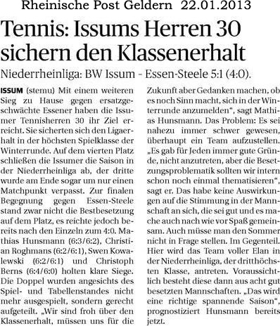 ISSUM (stemu) Mit einem weiteren Sieg zu Hause gegen ersatzgeschwächte Essener haben die Issumer Tennisherren 30 ihr Ziel erreicht. Sie sicherten sich den Ligaerhalt in der höchsten Spielklasse der Winterrunde. Auf dem vierten Platz schließen die Issumer die Saison in der Niederrheinliga ab, der dritte wurde am Ende sogar um nur einen Matchpunkt verpasst. Zur finalen Begegnung gegen Essen-Steele stand zwar nicht die Bestbesetzung auf dem Platz, es reichte jedoch bereits nach den Einzeln zum 4:0. Mathias Hunsmann (6:3/6:2), Christian Roghmans (6:2/6:1), Swen Kowalewski (6:2/6:1) und Christoph Berns (6:4/6:0) holten klare Siege. Die Doppel wurden angesichts des Spiel- und Tabellenstandes nicht mehr ausgespielt, sondern gerecht aufgeteilt. „Wir sind froh über den Klassenerhalt, müssen uns für die Zukunft aber Gedanken machen, ob es noch Sinn macht, sich in der Winterrunde anzumelden“, sagt Mathias Hunsmann. Das Problem: Es sei nahezu immer schwer gewesen, überhaupt ein Team aufzustellen. „Es gab für Jeden immer gute Gründe, nicht anzutreten, aber die Besetzungsproblematik sollten wir intern schon noch einmal thematisieren“, sagt er. Das habe keine Auswirkungen auf die Stimmung in der Mannschaft an sich, die sei gut und es mache auch nach wie vor Spaß gemeinsam. Auch müsse man den Sommer nicht in Frage stellen. Im Gegenteil. Hier wird das Team voller Elan in der Niederrheinliga, der dritthöchsten Klasse, antreten. Voraussichtlich besteht diese dann aus acht gut besetzten Mannschaften. „Das wird eine richtige spannende Saison“, prognostiziert Hunsmann bereits jetzt.