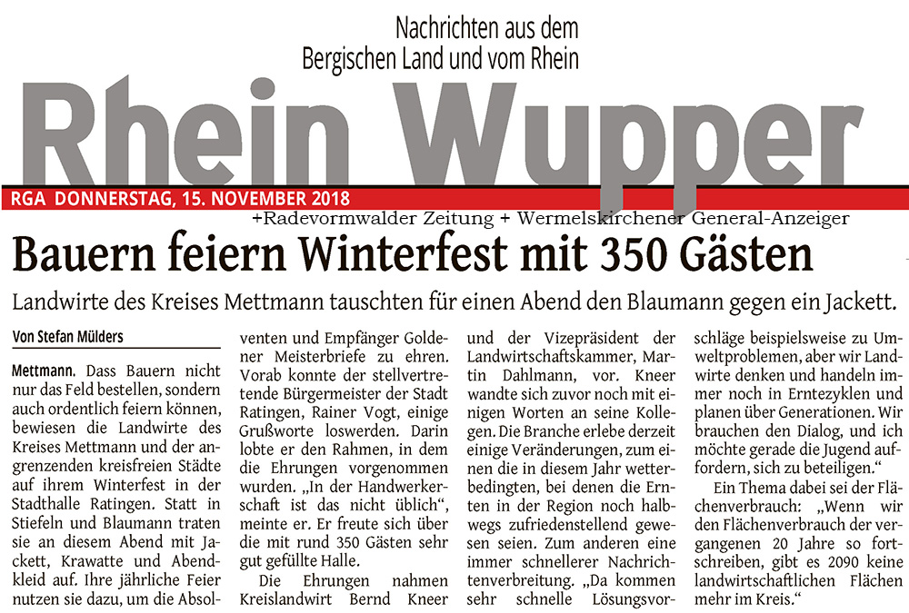 KREIS METTMANN Das Bauern nicht nur das Feld bestellen sondern auch ordentlich feiern können bewiesen die Landwirte des Kreises Mettmann und der angrenzenden kreisfreien Städte auf ihrem traditionellen Winterfest in der Stadthalle Ratingen. Statt in Stiefeln und Blaumann traten sie an diesem Abend mit Jacket, Krawatte und Abendkleid auf. Ihre jährliche Feier nutzen sie dazu, um die Absolventen und Empfänger Goldener Meisterbriefe zu ehren. Vorab konnte der stellvertretende Bürgermeister der Stadt Ratingen, Rainer Vogt, einige Grußworte loswerden. Darin lobte er den Rahmen, in dem die Ehrungen vorgenommen wurden. „In der Handwerkerschaft ist das nicht üblich“, meinte er. Er freute sich über die mit rund 350 Gästen sehr gut gefüllt Halle und betonte die Wichtigkeit landwirtschaftlicher Arbeit. „Auch als Heger und Pfleger der Kulturlandschaft nehmen sie gerade am Rande der Ballungsgebiete eine bedeutende Aufgabe wahr.“