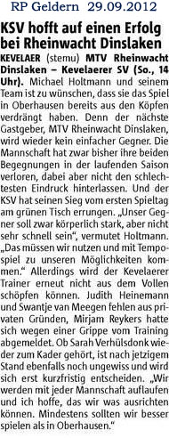 KEVELAER (stemu) MTV Rheinwacht Dinslaken - Kevelaerer SV (So., 14 Uhr). Michael Holtmann und seinem Team ist zu wünschen, dass sie das Spiel in Oberhausen bereits aus den Köpfen verdrängt haben. Denn der nächste Gastgeber, MTV Rheinwacht Dinslaken, wird wieder kein einfacher Gegner. Die Mannschaft hat zwar bisher ihre beiden Begegnungen in der laufenden Saison verloren, dabei aber nicht den schlechtesten Eindruck hinterlassen. Und der KSV hat seinen Sieg vom ersten Spieltag am grünen Tisch errungen. „Unser Gegner soll zwar körperlich stark, aber nicht sehr schnell sein“, vermutet Holtmann. „Das müssen wir nutzen und mit Tempospiel zu unseren Möglichkeiten kommen.“ Allerdings wird der Kevelaerer Trainer erneut nicht aus dem Vollen schöpfen können. Judith Heinemann und Swantje van Meegen fehlen aus privaten Gründen, Mirjam Reykers hatte sich wegen einer Grippe vom Training abgemeldet. Ob Sarah Verhülsdonk wieder zum Kader gehört, ist nach jetzigem Stand ebenfalls noch ungewiss und wird sich erst kurzfristig entscheiden. „Wir werden mit jeder Mannschaft auflaufen und ich hoffe, das wir was ausrichten können. Mindestens sollten wir besser spielen als in Oberhausen.“