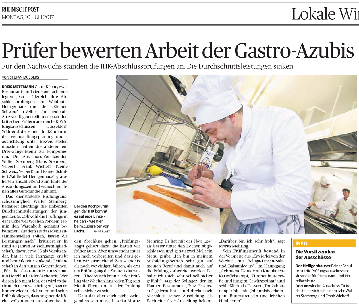 KREIS METTMANN In der vergangenen Woche konnten zehn Köche, zwei Restaurant- und vier Hotelfachleute erfolgreich ihre Abschlussprüfungen im Waldhotel Heiligenhaus und der „Kleinen Schweiz“ in Velbert-Tönisheide ablegen. An zwei Tagen stellten sie sich den kritischen Prüfern aus den IHK-Prüfungsausschüssen Düsseldorf. Während die einen ihr Können in der Veranstaltungsplanung und –ausrichtung unter Beweis stellen mussten, hatten die anderen ein Drei-Gänge-Menü zu komponieren. Die Ausschuss-Vorsitzenden Walter Stemberg (Haus Stemberg, Velbert), Frank Wiehoff (Kleine Schweiz, Velbert) und Rainer Schulte (Waldhotel Heiligenhaus) gratulierten anschließend zum Ende der Ausbildungszeit und wünschten ihnen Alles Gute für die Zukunft.