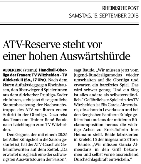 ALDEKERK (stemu) Handball Oberliga Frauen: TV Witzhelden - TV Aldekerk II (So., 17 Uhr). Nach dem klaren Sieg, den die überwiegend erste Mannschaft im Namen der zweiten am ersten Spieltag erzielen konnte, kommt jetzt für die eigentliche Stammbesetzung der Nachwuchstruppe der erste Auftritt in der Oberliga. Dazu reist das Team um Trainer René Baude nach Leichlingen zum TV Witzhelden. Die hatte er bereits im Vorfeld der Saison zu den Geheimfavoriten gezählt, was sie mit einem knappen Auftaktsieg beim ATV-Nachbarn Adler Königshof auch ansatzweise beweisen konnten. „Das wird für uns gleich zu Beginn eine der schwierigsten Auswärtstouren der Saison“, sagt Baude. „Wir müssen jetzt vom Jugend-Bundesligamodus wieder umschalten auf die Oberliga und erwarten ein harzfreies Spiel. Das wird schwer genug und ein Sieg ist alles andere als selbstverständlich.“ Er sei froh, wenn es gelingen würde, konsequent mitzuhalten und das Spiel eng zu gestalten – wenngleich natürlich ein Zwei-Punkte-Erfolg das Ziel ist. Gefährlichste Spielerin bei Witzhelden dürfte Elis Garcia Almendaris sein, die schon in Leverkusen und bei den Bergischen Panthern die Aufstiege mitgestaltet hat und aus der mittleren Rückraumposition heraus die wichtige Achse zur Kreisläuferin Ines Heimann stellt. Beide zusammen fabrizierten in Krefeld 15 der insgesamt 28 Tore. „Für uns gilt es, Garcia Almendaris in den Griff zu bekommen, ihre Anspiele an den Kreis zu verhindern und selbst vorne ausreichend Durchschlagskraft zu entwickeln.“ Davon abgesehen muss Baude im Innenblock Emma Molderings ersetzen, die aus privaten Gründen nicht dabei sein kann.