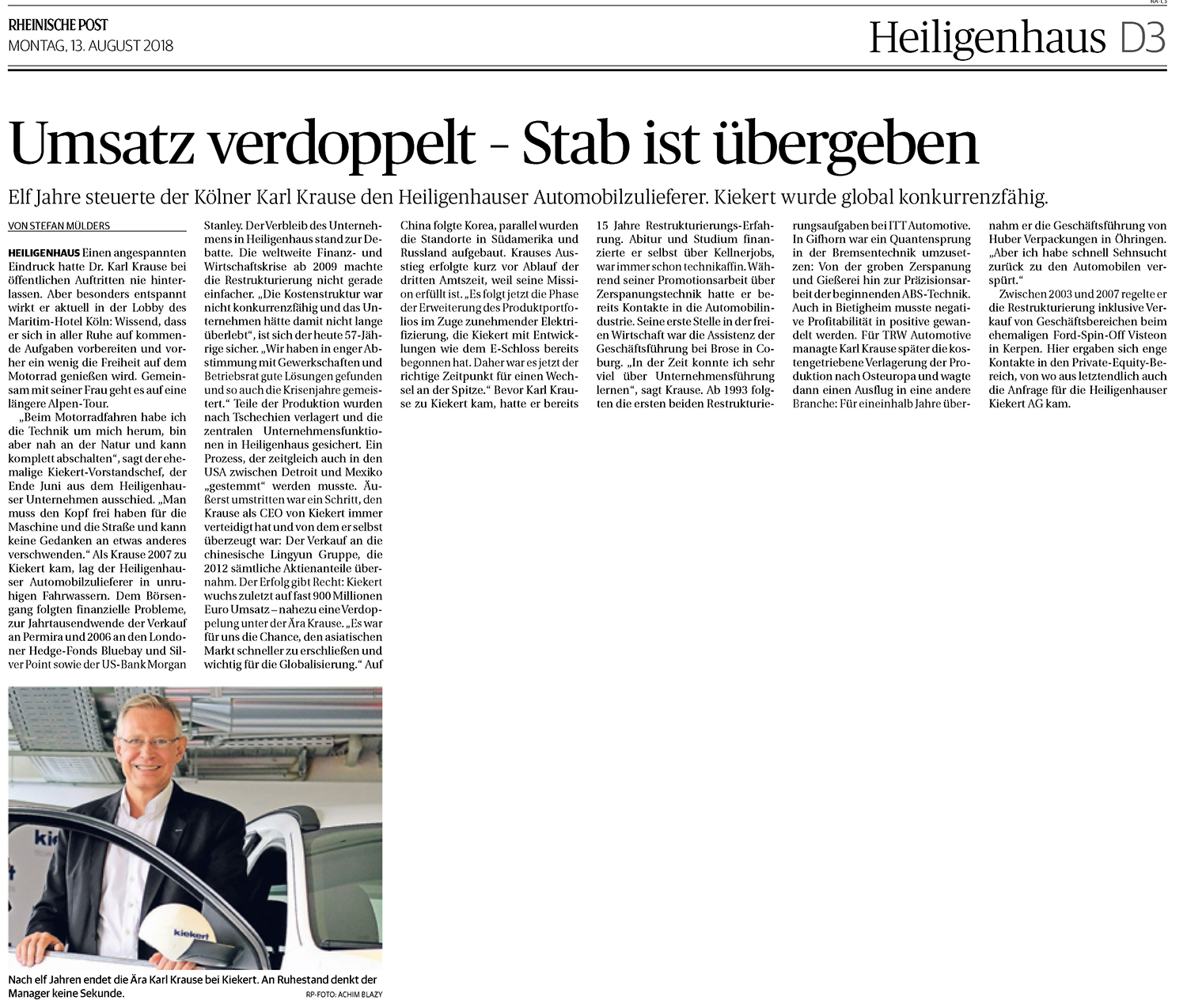 Bevor Karl Krause zu Kiekert kam, hatte er bereits 15 Jahre Restrukturierungs-Erfahrung. Abitur und Studium finanzierte er selbst über Kellnerjobs, war immer schon technikaffin. Während seiner Promotionsarbeit über Zerspanungstechnik hatte er bereits Kontakte in die Automobilindustrie. Seine erste Stelle in der freien Wirtschaft war die Assistenz der Geschäftsführung bei Brose in Coburg. „In der Zeit konnte ich sehr viel über Unternehmensführung lernen“, sagt Krause. Ab 1993 folgten die ersten beiden Restrukturierungsaufgaben bei ITT Automotive. In Gifhorn war ein Quantensprung in der Bremsentechnik umzusetzen: Von der groben Zerspanung und Gießerei hin zur Präzisionsarbeit der beginnenden ABS-Technik. Auch in Bietigheim musste negative Profitabilität in positive gewandelt werden. Für TRW Automotive managte Karl Krause später die kostengetriebene Verlagerung der Produktion nach Osteuropa und wagte dann einen Ausflug in eine andere Branche: Für eineinhalb Jahre übernahm er die Geschäftsführung von Huber Verpackungen in Öhringen. „Aber ich habe schnell Sehnsucht zurück zu den Automobilen verspürt.“ Zwischen 2003 und 2007 regelte er die Restrukturierung inklusive Verkauf von Geschäftsbereichen beim ehemaligen Ford-Spin-Off Visteon in Kerpen. Hier ergaben sich enge Kontakte in den Private-Equity-Bereich, von wo aus letztendlich auch die Anfrage für die Heiligenhauser Kiekert AG kam.