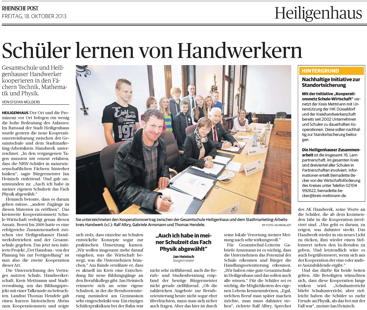 Die Unterzeichnung des Vertrages nutzten Schule, Handwerkerschaft, Kreis Mettmann und Stadtverwaltung, um das Bildungsprojekt mit einer Talkrunde zu beleuchten. Landrat Thomas Hendele gab einen kurzen historischen Abriss zum Kooperationsnetz und zeigte sich stolz, dass einzelne an Schulen entwickelte Konzepte sogar zur praktischen Umsetzung kamen. „Wir wollen insgesamt mehr darauf eingehen, was die Wirtschaft bewegt, was die Unternehmen brauchen.“ Am Rande erwähnte er, dass es aktuell im Kreis eine Entscheidung für neue Bildungsgänge an den Berufskollegs gibt. Jan Heinisch erinnerte sich an seine eigene Schulzeit, in der die Berufsorientierung zumindest am Gymnasium sehr eingeschränkt war. Ein einziges Schülerpraktikum bei der Bahn war nicht sehr zielführend, auch die Berufs- und Studienberatung empfand der heutige Bürgermeister nicht gerade zielführend. „Ob die zahlreichen Angebote zur Berufsorientierung heute nicht sogar eher überfrachten, muss man sich sicher auch fragen. Aber das hier ist durch seine lokale Verortung meiner Meinung nach sehr wirkungsvoll.“