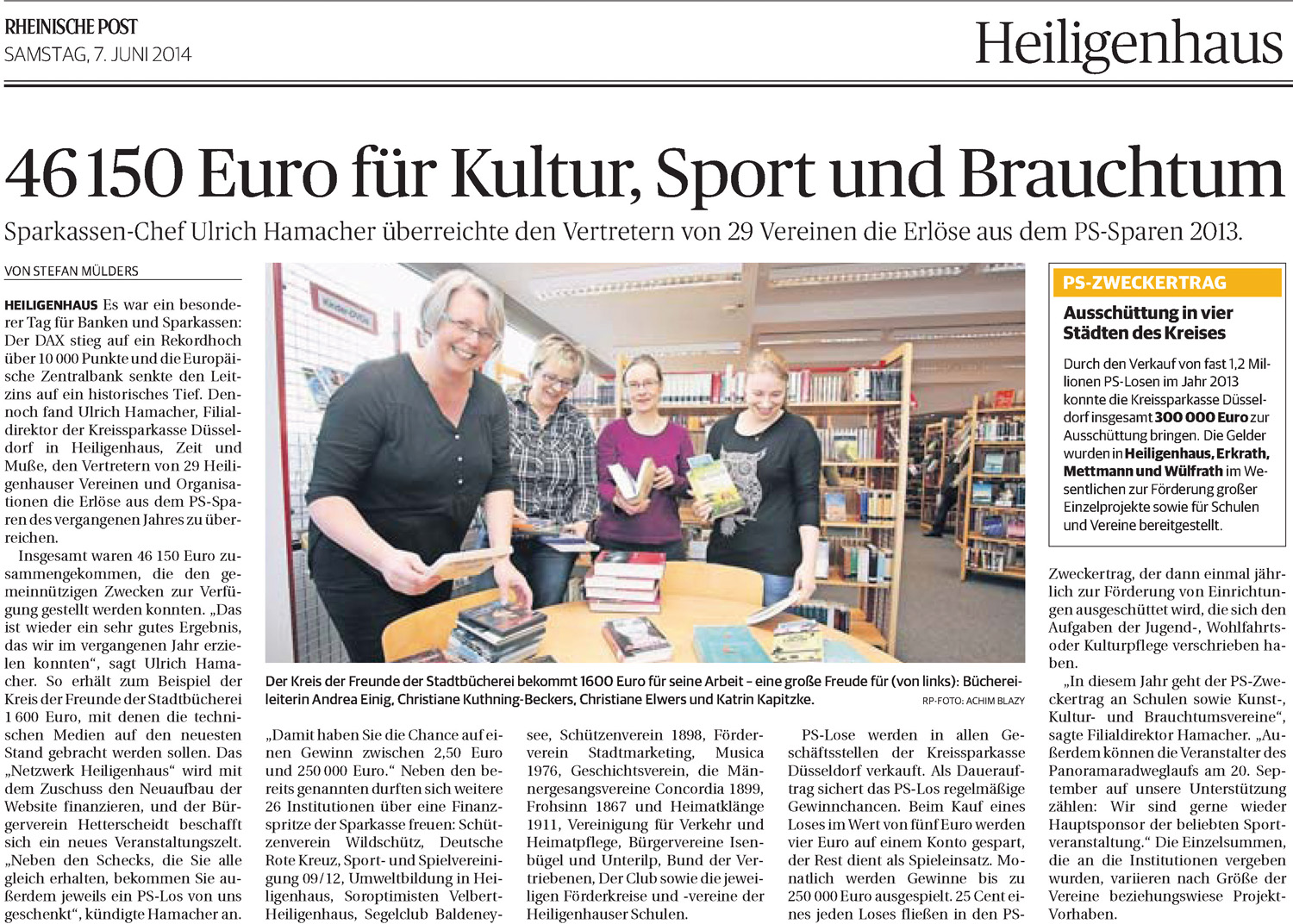 Durch den Verkauf von fast 1,2 Millionen PS-Losen im Jahr 2013 konnte die Kreissparkasse Düsseldorf insgesamt 300 000 Euro zur Ausschüttung bringen. Die Gelder wurden in Heiligenhaus, Erkrath, Mettmann und Wülfrath im Wesentlichen zur Förderung großer Einzelprojekte sowie für Schulen und Vereine bereitgestellt.