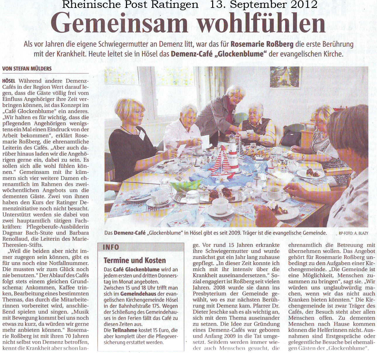 Hösel. Als vor Jahren die eigene Schwiegermutter an Demenz litt, war das für Rosemarie Roßberg die erste Berührung mit der Krankheit. Heute leitet sie in Hösel das Demenz-Café "Glockenblume" der evangelischen Kirche.
