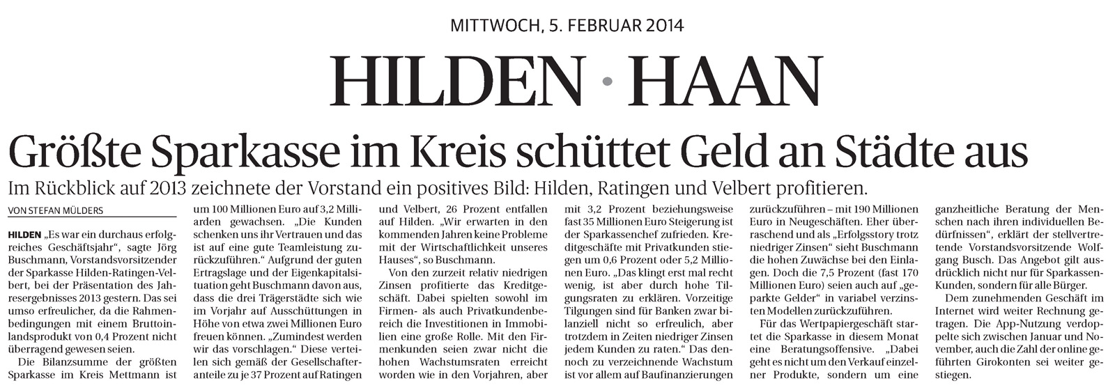 KREIS METTMANN „Es war ein normales, aber für uns durchaus erfolgreiches Geschäftsjahr ohne herausragende Ereignisse“, sagte Jörg Buschmann, der Vorstandsvorsitzende der Sparkasse Hilden-Ratingen-Velbert, bei der gestrigen Präsentation des Jahresergebnisses 2013. Das sei umso erfreulicher, da die Rahmenbedingungen mit zum Beispiel einem Bruttoinlandsprodukt von 0,4 Prozent nicht so überragend gewesen seien. „Im europäischen Vergleich dürfen wir allerdings auch mit diesem recht geringen Wert doch noch zufrieden sein.“