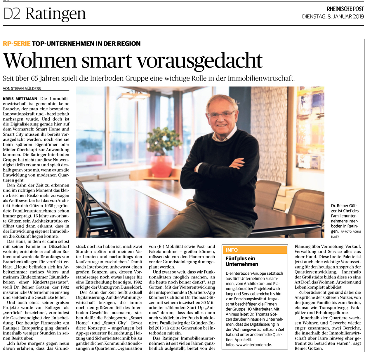 Der Zahn der Zeit heißt aktuell Digitalisierung. Auf die Wohnungswirtschaft bezogen, die immer noch den größeren Teil des Interboden-Geschäfts ausmacht, stehen dafür die Schlagworte „Smart Home“ und „Smart City“. Bevor diese Konzepte – angefangen bei App-gesteuerter Beleuchtung, Heizung und Sicherheitstechnik bis zu ganzheitlichen Kommunikationslösungen in Quartieren, Organisation von (E-) Mobilität sowie Post- und Paketannahme – greifen können, müssen sie von den Planern noch vor der Grundsteinlegung durchgeplant werden. „Und zwar so weit, dass wir Funktionalitäten möglich machen, an die heute noch keiner denkt“, sagt Reiner Götzen. Mit der Weiterentwicklung der entsprechenden Quartiers-App kümmert sich Sohn Dr. Thomas Götzen mit seinem inzwischen 30 Mitarbeiter zählenden Start-Up „Animus“ darum, dass das alles dann auch wirklich in der Praxis funktioniert. Parallel stieg der Gründer-Enkel 2013 als dritte Generation bei Interboden mit ein.