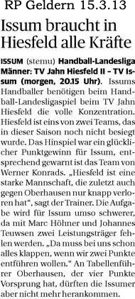 ISSUM (stemu) Handball-Landesliga Männer: TV Jahn Hiesfeld II - TV Issum (morgen, 20.15 Uhr). Issums Handballer benötigen beim Handball-Landesligaspiel beim TV Jahn Hiesfeld die volle Konzentration. Hiesfeld ist eins von zwei Teams, das in dieser Saison noch nicht besiegt wurde. Das Hinspiel war ein glücklicher Punktgewinn für Issum, entsprechend gewarnt ist das Team von Werner Konrads. „Hiesfeld ist eine starke Mannschaft, die zuletzt auch gegen Oberhausen nur knapp verloren hat“, sagt der Trainer. Die Aufgabe wird für Issum umso schwerer, da mit Marc Höhner und Johannes Teuwsen zwei Leistungsträger fehlen werden. „Da muss bei uns schon alles klappen, wenn wir zwei Punkte entführen wollen.“ An Tabellenführer Oberhausen, der vier Punkte Vorsprung hat, dürften die Issumer aber nicht mehr herankommen.