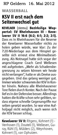 KEVELAER (stemu) Bezirksliga Wuppertal: SV Rheinhausen III - Kevelaerer SV II 16:6 (6:2; 6:1; 2:2; 2:1). Dass es in Rheinhausen für die Reserve der Kevelaerer Wasserballer nichts zu holen geben würde, war klar: Zu der 7:20-Niederlage aus dem Hinspiel gesellte sich erneut eine Minimalbesetzung. Als Notnagel hatte sich sogar der angeschlagene Coach Gerd Wellesen mit aufgeboten. „Mehr als Schadensbegrenzung zu setzen können wir heute nicht verlangen“, hatte er als Devise ausgegeben. Und das gelang weniger gut. Immer wieder schwamm der KSV in Konter hinein. Nahezu alle Rheinhausener Tore fielen durch Konter. Nach der Pause lief es in der Defensive besser. Allerdings hatten die Kräfte schon sehr gelitten, sodass eigene schnelle Gegenangriffe nur selten gesetzt wurden. So war eine Aufholjagd nicht möglich, auch wenn sich der KSV besser schlug.