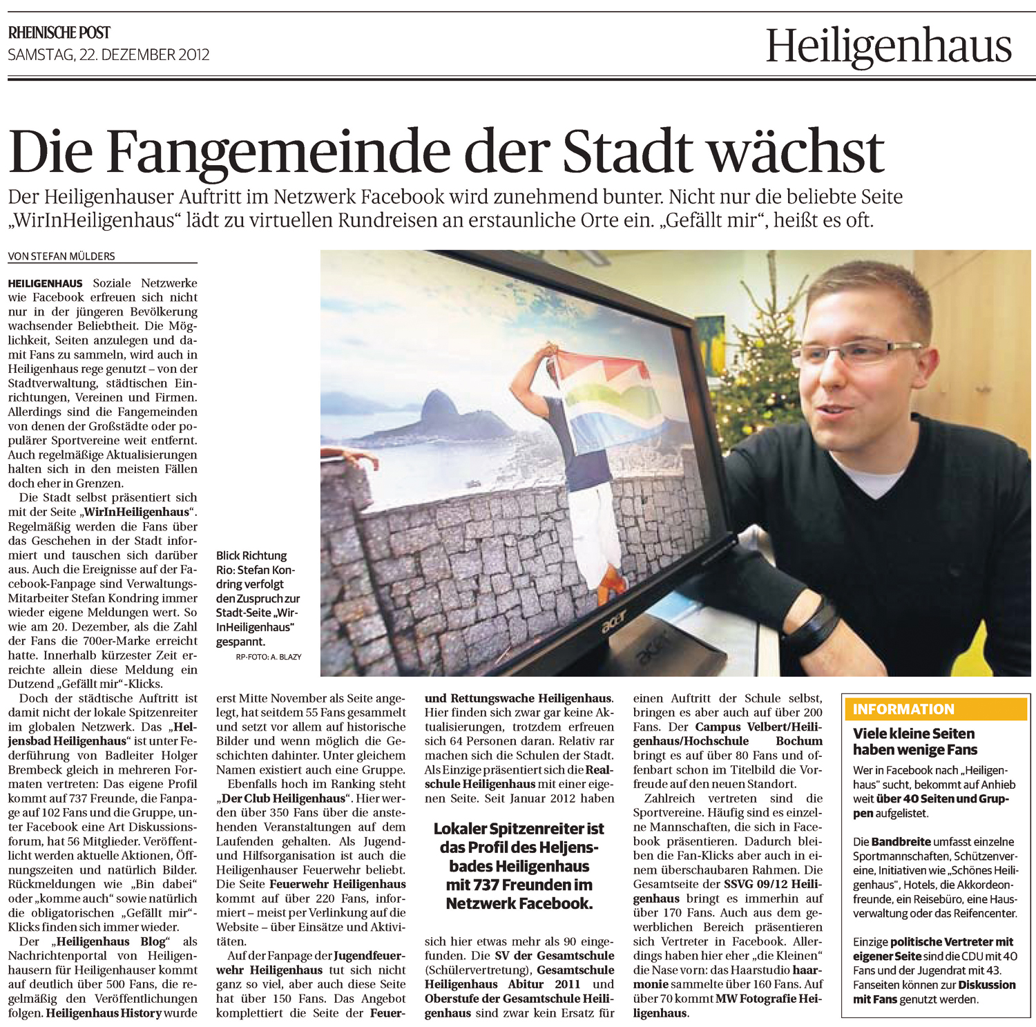 Die Stadt selbst präsentiert sich mit der Seite "WirInHeiligenhaus". Regelmäßig werden die Fans über das Geschehen in der Stadt informiert und tauschen sich darüber aus. Auch die Ereignisse auf der Facebook-Fanpage sind Verwaltungs-Mitarbeiter Stefan Kondring immer wieder eigene Meldungen wert. So wie am 20. Dezember, als die Zahl der Fans die 700er-Marke erreicht hatte. Innerhalb kürzester Zeit erreichte allein diese Meldung ein Dutzend "Gefällt mir"-Klicks.