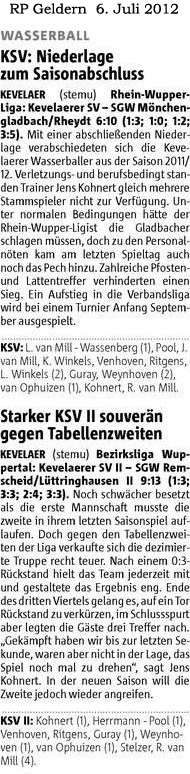 KEVELAER (stemu) Rhein-Wupper-Liga: Kevelaerer SV - SGW Mönchengladbach/Rheydt 6:10 (1:3; 1:0; 1:2; 3:5). Mit einer abschließenden Niederlage verabschiedeten sich die Kevelaerer Wasserballer aus der Saison 2011/12. Verletzungs- und berufsbedingt standen Trainer Jens Kohnert gleich mehrere Stammspieler nicht zur Verfügung. Unter normalen Bedingungen hätte der Rhein-Wupper-Ligist die Gladbacher schlagen müssen, doch zu den Personalnöten kam am letzten Spieltag auch noch das Pech hinzu. Zahlreiche Pfosten- und Lattentreffer verhinderten einen Sieg. Ein Aufstieg in die Verbandsliga wird bei einem Turnier Anfang September ausgespielt.