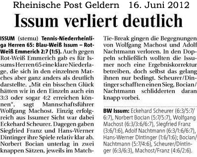 ISSUM (stemu) Tennis-Niederrheinliga Herren 65: Blau-Weiß Issum - Rot-Weiß Emmerich 2:7 (1:5). Auch gegen Rot-Weiß Emmerich gab es für Issums Herren 65 eine klare Niederlage, die sich in den einzelnen Matches aber ganz anders als deutlich darstellte. „Mit ein bisschen Glück hätten wir in den Einzeln auch ein 3:3 oder sogar 4:2 erreichen können“, sagt Mannschaftsführer Wolfgang Machost. Einzig erfolgreich aus Issumer Sicht war dabei Eckehard Scheurer. Dagegen gaben Siegfried Franz und Hans-Werner Dintinger ihre Spiele relativ klar ab. Norbert Bocian unterlag in zwei knappen Sätzen, jeweils im Match-Tie-Break gingen die Begegnungen von Wolfgang Machost und Adolf Nachtmann verloren. In den Doppeln schließlich wollten die Issumer noch eine Ergebniskorrektur betreiben, doch selbst das gelang ihnen nur bedingt. Scheurer/Dintinger schafften einen Sieg, Bocian/Nachtmann schlidderten daran knapp vorbei.