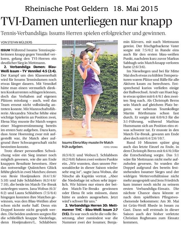 ISSUM (stemu) Tennis 2. Verbandsliga Damen: Blau-Weiß Issum – TV Vennikel 4:5 (2:4). Der Kampf um den Klassenerhalt wird für Issums Tennisdamen noch etwas länger dauern. Mit Vennikel hätte man einen vermutlich direkten Konkurrenten schlagen können, doch das Vorhaben auf eigenen Plätzen misslang – auch, weil das Teams erneut nicht vollständig hatte antreten können. Mit Mannschaftsführerin Alexandra Nitsche fehlte eine wichtige Spielerin an Position zwei, Elena May musste ihr Match wegen einer Magenverstimmung bereits im ersten Satz aufgeben. Dazu kam, dass Anne Hoenning zwar mit aufgestellt war, ihr Match aber aufgrund ihrer Schwangerschaft nicht bestreiten konnte. Trotz dieser personellen Schwächung wäre ein Sieg immer noch möglich gewesen, wie die am Ende knappen Resultate beweisen. Aber das notwendige Quäntchen Glück fehlte gleich in zwei Matches; denen von Resie Hoeijmakers (6:4/1:6/5:10) und Jule Schlabbers (6:3/4:6/7:10), die beide im Match-Tie-Break unterlegen waren. Jana Wobus (6:3/6:2) und Laura Schlabbers (7:5/6:4) hingegen konnten ihre Matches gewinnen, was aber den Blau-Weißen schon nicht mehr half. Denn ein Doppel konnte nicht gespielt werden. Die beiden anderen sorgten für die schließlich knappe Niederlage, denn Hoeijmakers/L. Schlabbers (6:3/6:3) und Wobus/J. Schlabbers (6:2/6:0) fuhren zwei weitere Punkte ein.