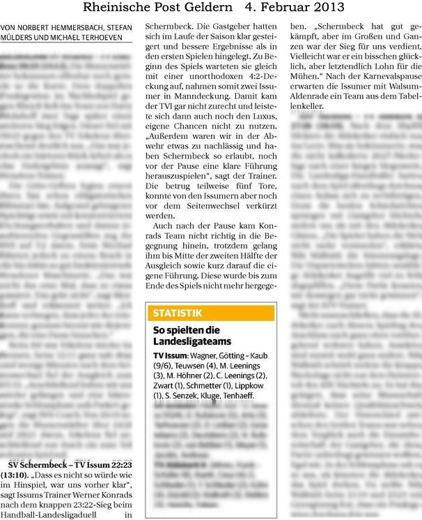 TV Issum: Wagner, Götting - Kaub (9/6), Teuwsen (4), M. Leenings (3), M. Höhner (2), C. Leenings (2), Zwart (1), Schmetter (1), Lippkow (1), S. Senzek, Kluge, Tenhaeff.
