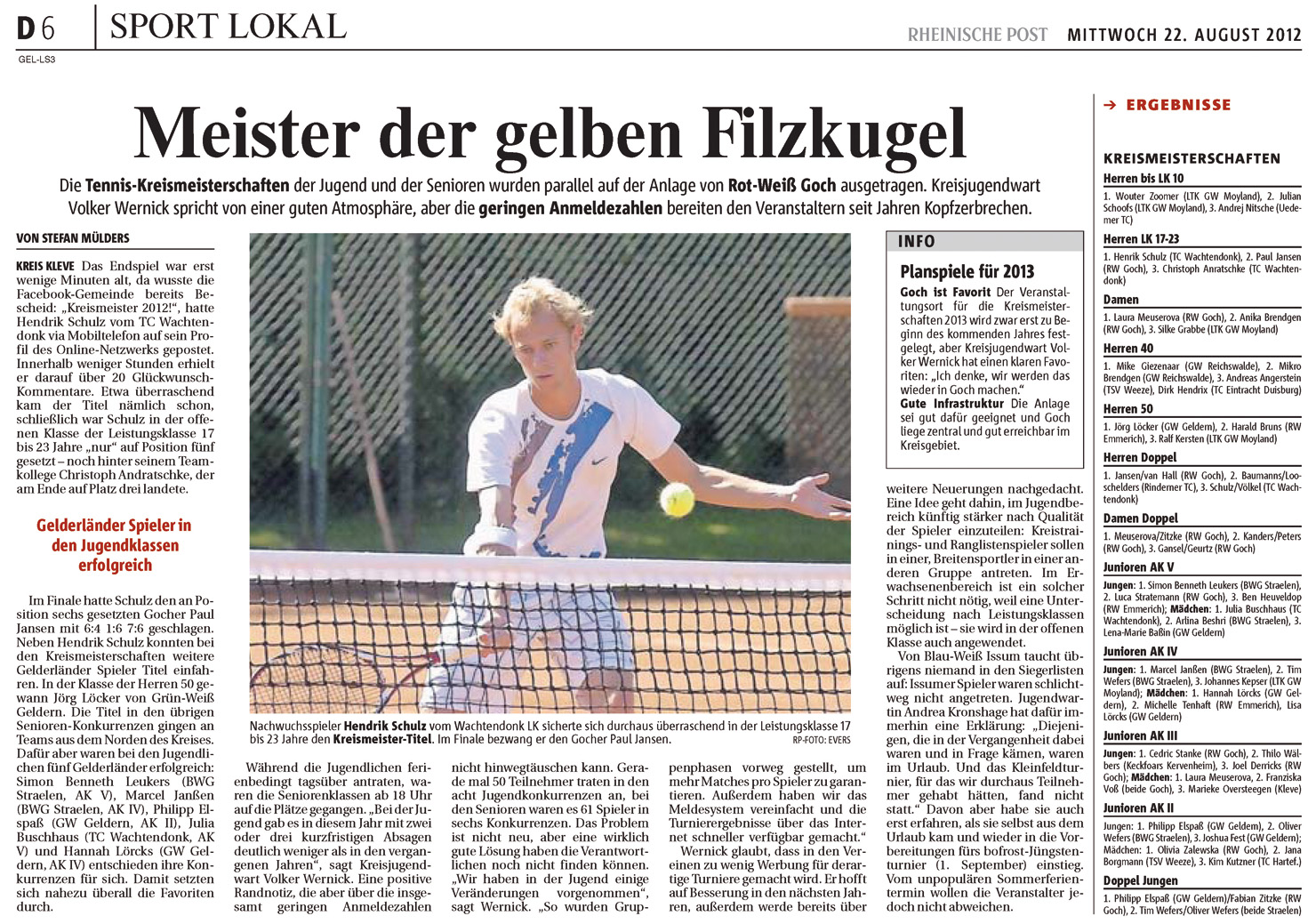KREIS KLEVE Das Endspiel war erst wenige Minuten alt, da wusste die Facebook-Gemeinde bereits Bescheid: „Kreismeister 2012!“ hatte Hendrik Schulz vom TC Wachtendonk via Mobiltelefon auf sein Profil gepostet. Innerhalb weniger Stunden erhielt er darauf über 20 Glückwunsch-Kommentare. Etwa überraschend war das schon, denn Schulz war in der offenen Klasse der Leistungsklasse 17 bis 23 „nur“ auf Position fünf gesetzt, hinter Teamkollege Christoph Andratschke, der am Ende auf Platz drei landete. Im Finale hatte Schulz den Gocher Paul Jansen, an sechs gesetzt, knapp mit 6:4/1:6/7:6 geschlagen. Neben Hendrik Schulz konnten bei den Kreismeisterschaften weitere Gelderländer Spieler Titel einfahren. In der Klasse der Herren 50 gewann Jörg Löcker von Grün-Weiß Geldern. Die Titel in den übrigen Senioren-Konkurrenzen gingen an Teams aus dem Norden des Kreises. Dafür aber waren bei den Jugendlichen fünf Gelderländer erfolgreich: Simon Benneth Leukers (BWG Straelen, AK V), Marcel Janßen (BWG Straelen, AK IV), Philipp Elspaß (GW Geldern, AK II), Julia Buschhaus (TC Wachtendonk, AK V) und Hannah Lörcks (GW Geldern, AK IV) entschieden ihre Konkurrenzen für sich. Damit setzten sich nahezu überall die Favoriten durch.