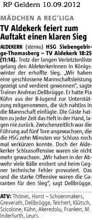 ALDEKERK (stemu) HSG Siebengebirge-Thomasberg - TV Aldekerk 18:25 (11:14). Trotz der langen Verletztenliste gelang den Aldekerkerinnen in Königswinter der erhoffte Sieg. „Wir haben eine geschlossene Mannschaftsleistung gezeigt und verdient gewonnen“, sagte Trainer Andreas Dellbrügge. Er hatte Pia Kühn aus der B-Jugend zur Unterstützung mitgenommen, die sich nahtlos in die Mannschaft einfügte. Die Gäste hatten zu jeder Zeit das Heft in der Hand, lagen nie zurück. Zwischenzeitlich war die Führung auf fünf Tore angewachsen, die die HSG zehn Minuten vor Schluss noch mal verkürzen konnte. Doch der Aldekerker Schlussoffensive waren sie nicht mehr gewachsen. „Wir haben in der Abwehr viele Bälle erobert und beim Gegner technische Fehler provoziert. Das und die starke Offensive waren die Garanten für den Sieg“, sagt Dellbrügge.